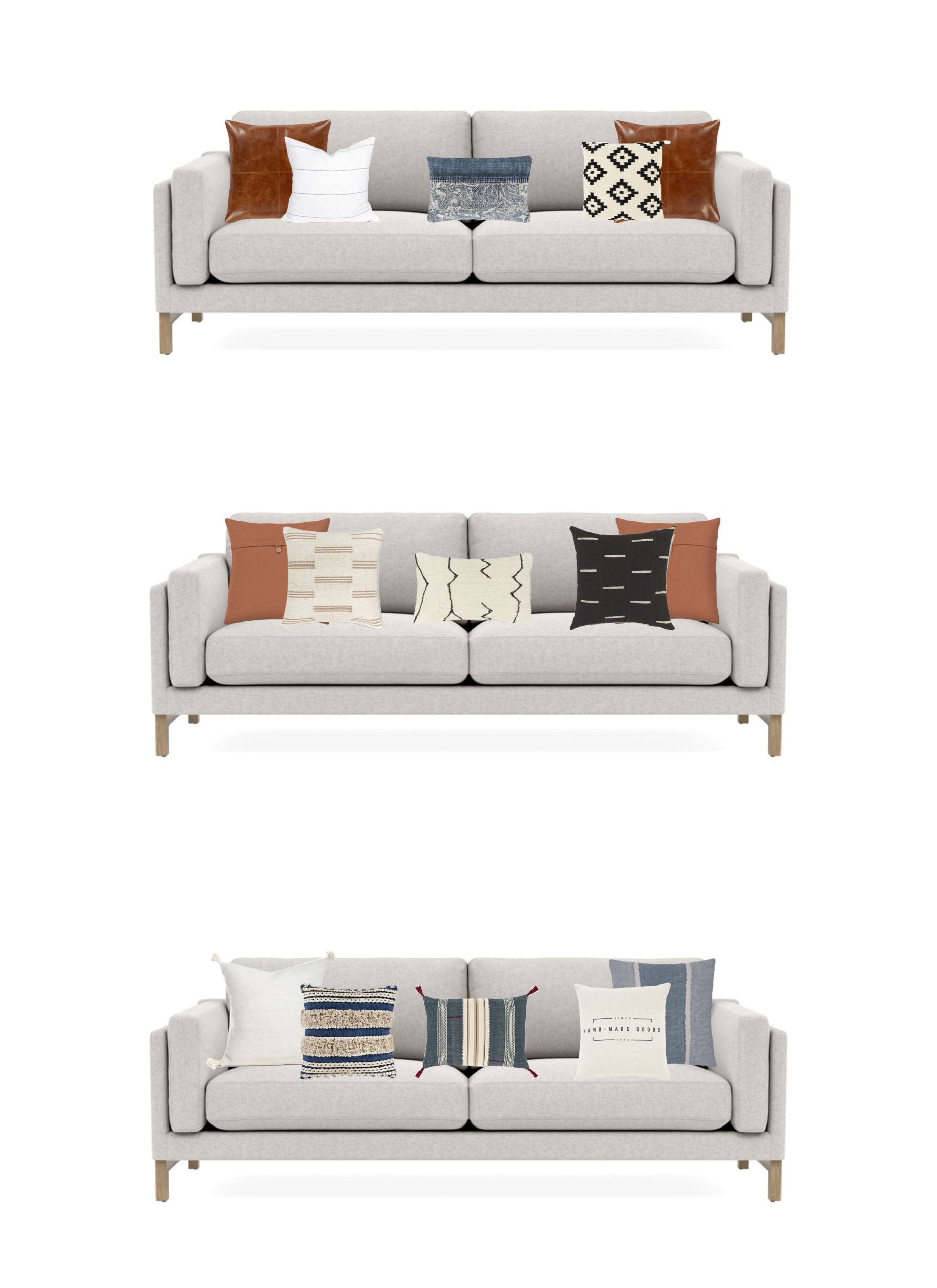 Here are a few Pillow visuals of the same sofa to share with you on how just adding pillows can make a difference. How simple it is to change out to different pillow options. Even just switching just one pillow can make a difference.