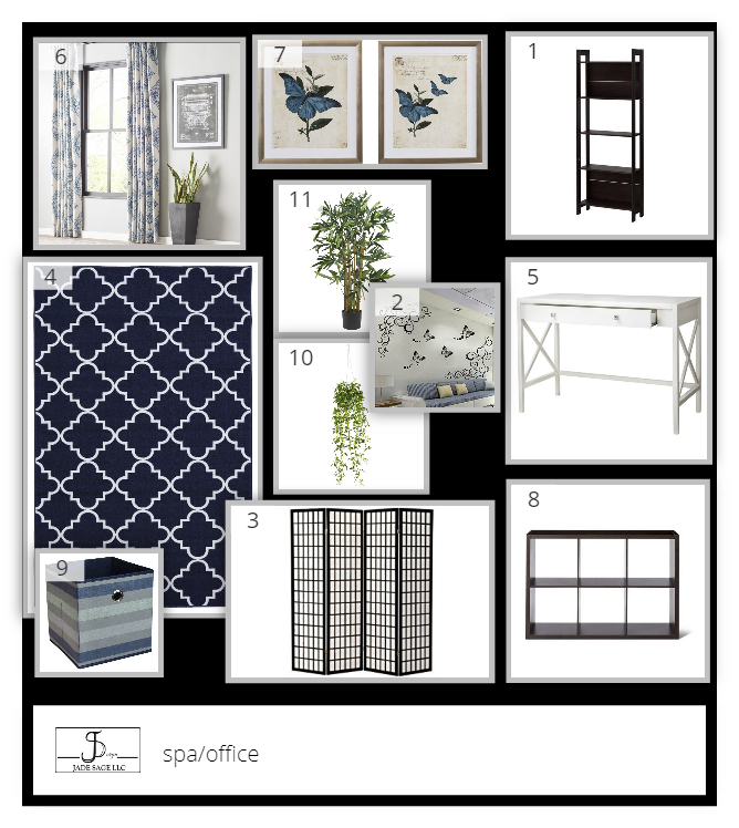 She also, need things to be movable to be able to hold yoga classes. She had a theme and her logo was butterflies. So, I wanted to incorporate that into the design somehow.  She needed it to be peaceful and zen feeling with  soothing colors.  We chose colors of blue, green, black and white.